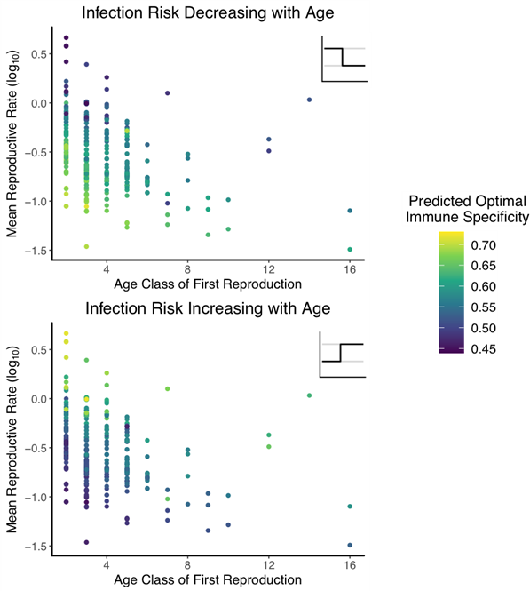 For each of these approximated life histories we identified the immune specificity maximizing fitness, giving us predictions in each epidemiological scenario for 298 matrices. We then analyzed the relationship between predicted optimal immune strategy and three specific life history traits: age at first reproduction, mean reproductive rate, and reproductive life expectancy. We found that each of these traits is associated with optimal immune specificity, but the strength and direction of the association depends on whether infection risk rises or falls at reproductive maturity and the magnitude of that change. And the direction of the association in a given context differs for different traits. When infection risk declines at reproductive maturity, age at first reproduction and mean reproductive rate both negatively associate with immune specificity, while reproductive life expectancy has a positive association. But when infection risk rises at reproductive maturity, the sign of each of these relationships flips. And each life history-immune specificity relationship is stronger when infection risk changes more at reproductive maturity.
