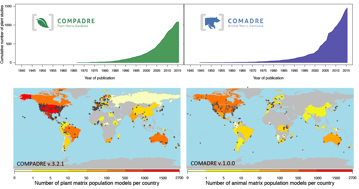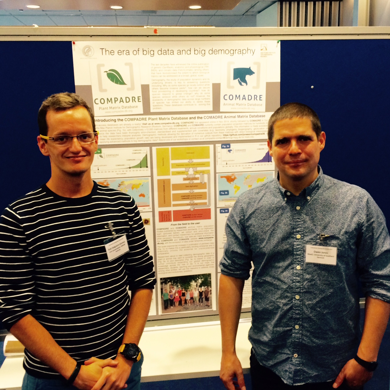 by Rob Salguero-Gomez on Oct 5, 2015Coinciding with the 3rd annual Evolutionary Demography Society conference, in Lunteren (the Netherlands), we announce the release of COMADRE v.1.0.0, an open-access database for animal demography. COMADRE comes online nearly a year after the release of its sister database, the COMPADRE Plant Matrix Database. COMADRE contains 345 animal species from 402 studies and 1,625 matrix population models of global distribution, ranging organisms as different as sponges, birds or mammals, including humans. The preprint of the manuscript introducing COMADRE is available in bioRxiv, and the manuscript is currently in review at Journal of Animal Ecology. Together with the release of COMADRE, we also release the new version of COMPADRE: v. 3.2.1. This version contains 637 plant species from 735 studies containing a total of 6,242 matrix population models. These are the updated user guides for COMPADRE and COMADRE. In an effort to remain as transparent as possible in the data digitalisation and error-checks effected in the database, we also make available the internal data entry protocols. The release COMADRE coincides too with a new look to the portal for both databases. The main aspect of this portal is that user registration is no longer required, making these databases fully open data and open access. Upcoming workshops on the usage of these resources are planned for EvoDemoS (Oct 2015), BES (Dec 2015) and a weeklong course at the Max Planck Institute for Demographic Research (April 2016, exact week TBA). We hope that the research community will use these databases for exciting ecological and evolutionary questions! Dr Rob Salguero-Gomez & Dr Owen Jones on behalf of the core committee PS: this is how our students (the COMPADRinos) feel about the release of COMADRE: