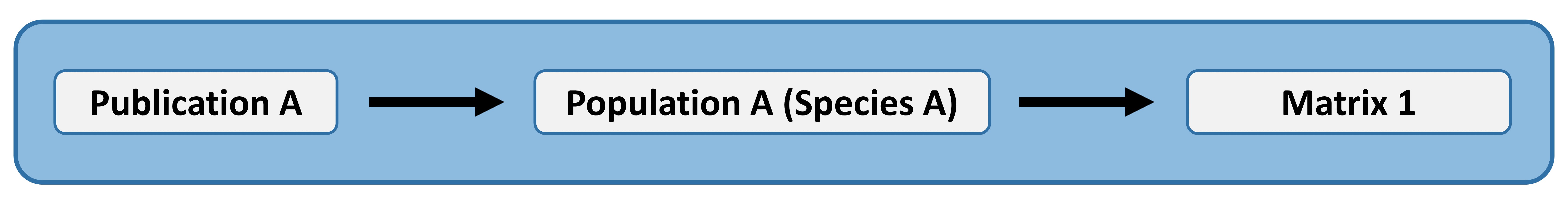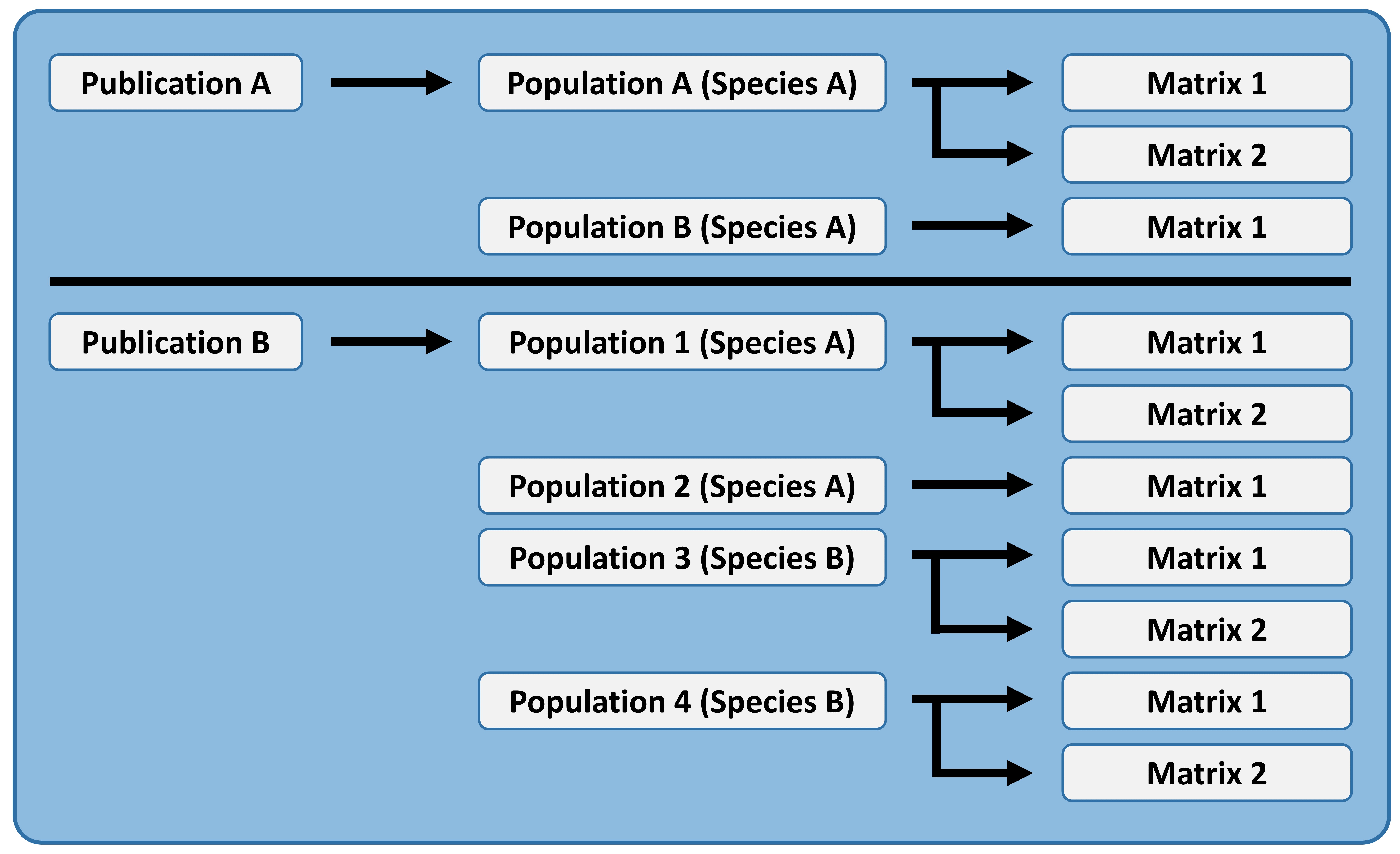 Digitization begins by creating a new "publication" and entering the associated data. From this form, you'll be able to create new populations where you'll enter population-level details for a study species. From within the population form, you'll be able to create the individual matrices. Creating a new matrix will take you to a separate form to enter matrix-associated metadata, and once those data are entered, you'll be able to edit the matrix values from the population form. The image below is a simplified visualization of this data entry workflow.